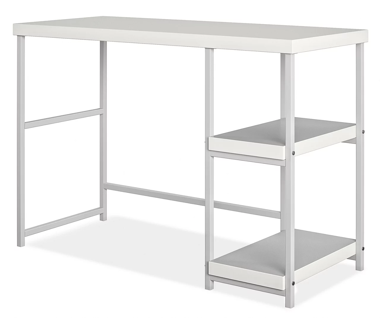 Your child can color and draw to their hearts content on the Ameriwood Kevin desk. Finish homework or work on art projects on the spacious desktop. The two open shelves provide space to store books, binders and craft supplies and keep your work surface clutter free. The crisp white finish seamlessly blends with any décor as the reversible side shelves allow you to have either white or gray shelves to match your child’s style.