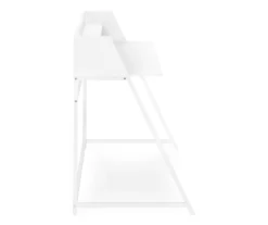 Look at your home office from a different angle with this computer desk featuring a storage hutch. The compact desktop has side panels that slant to seamlessly align with the attractive, trapezoid-shaped metal legs for a clean look. The hutch includes a long shelf that is the ideal size to hold small items like wireless speakers or a block of sticky notes. Supporting the desktop is a sturdy metal base with a support bar on back that runs parallel to the shelf. This contemporary laptop or writing table with a space-saving design is a great choice if you use your living room or bedroom as a home office.