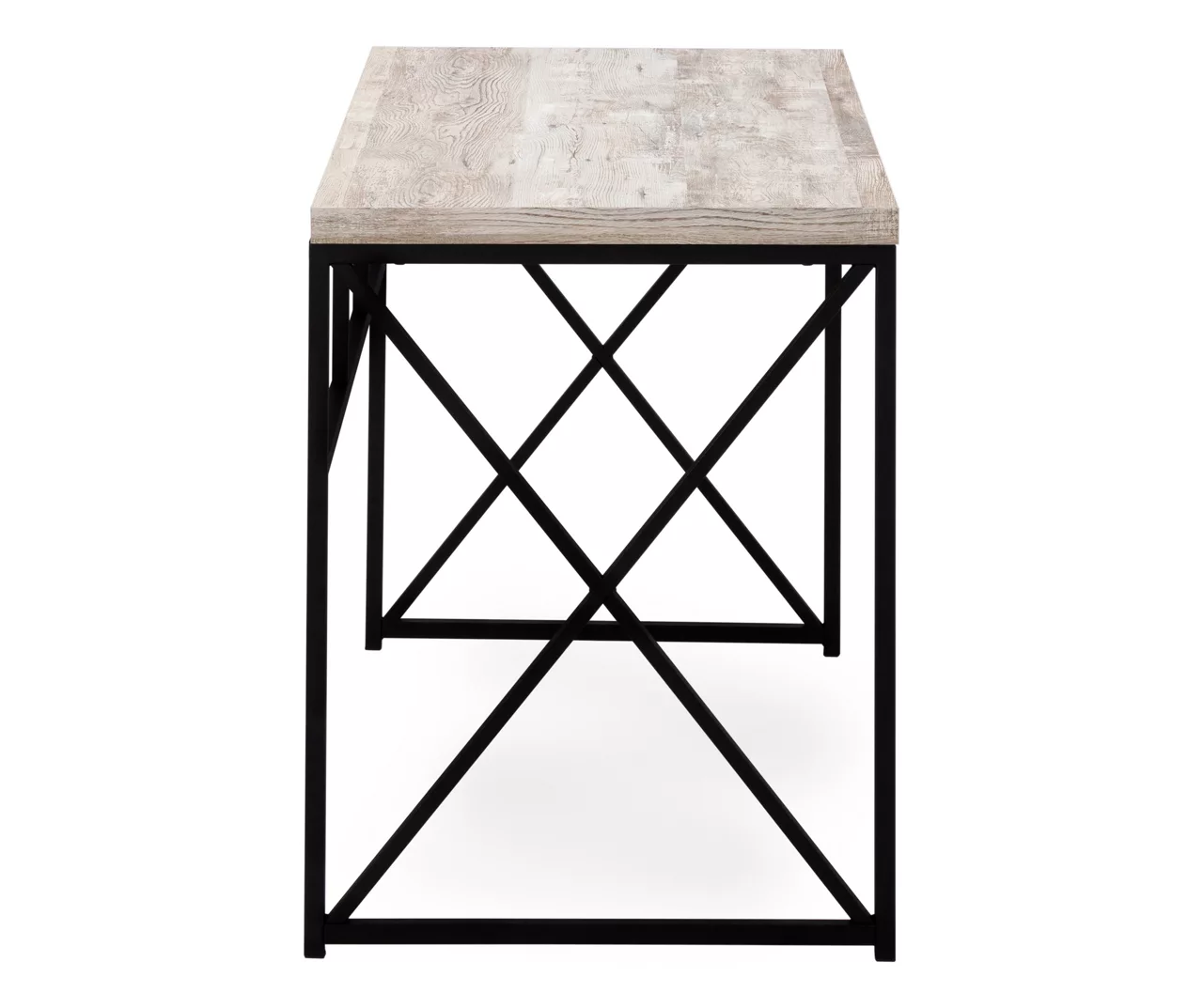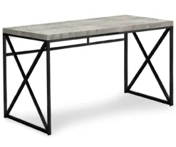 Equal parts space saving and style elevating, this compact desk is sized for small homes, apartments or condos. Featuring a modern, open design, in a reclaimed wood-look motif, a sturdy black metal X-design base ensures stability and offers lots of space to push in a chair. The thick panel top is perfect for a laptop, tablet, a lamp, a notebook and some important supplies to get the job done.