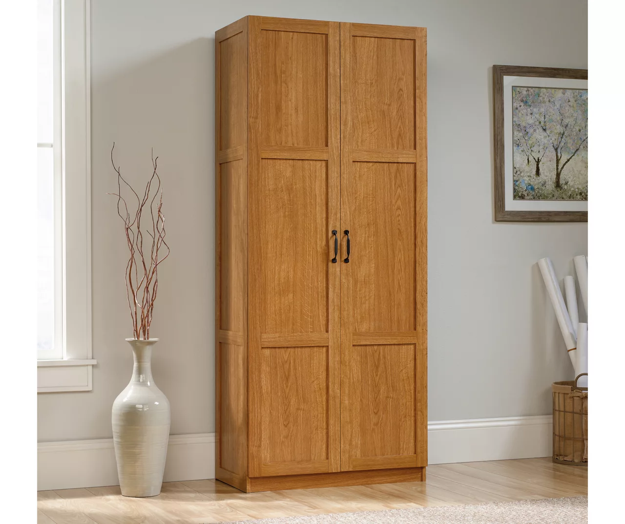 Extra storage is always a plus! This storage cabinet from the Sauder has room for all stuff. This double door storage cabinet features four adjustable shelves for customizable storage options depending on your needs. Whether you are storing books, binders or linens, this two-door storage cabinet will adjust quickly. A full-width upper shelf allows it to be the perfect place to stash bins, blankets, board games and more. Finished in dark Cinnamon Cherry, this tall cabinet is perfect for the kitchen, basement, garage or anywhere you need a storage solution.