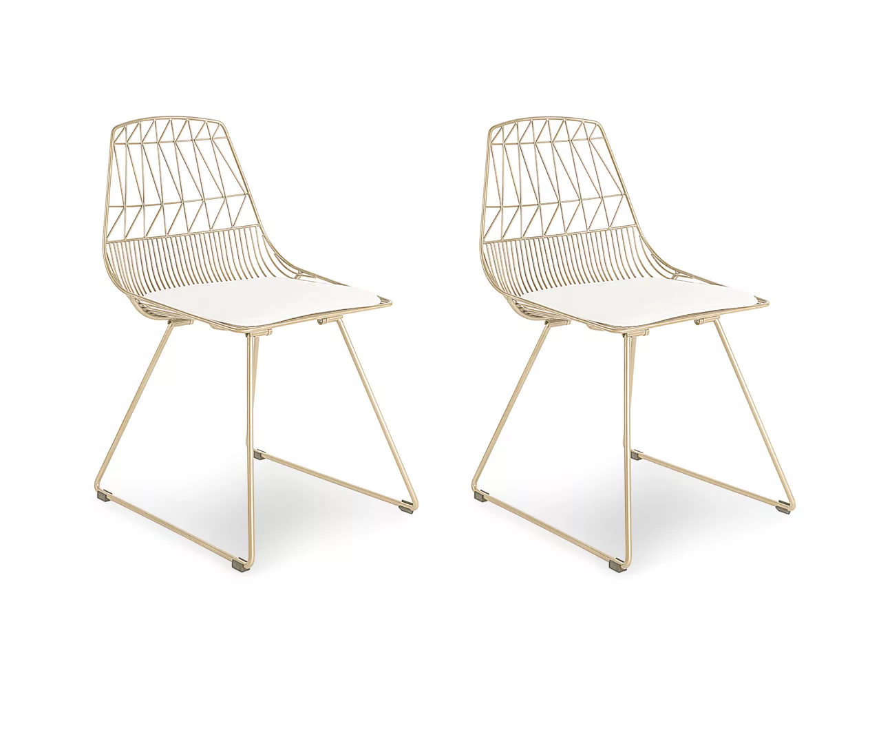 These art deco-inspired metal chairs are perfect for adding major style and zing to smaller spaces. The intricate geometric pattern is distinctive and, well, adorable, while the white padded seat comforts and supports. This set of two chairs is perfect for adding to a breakfast nook or dining room table.